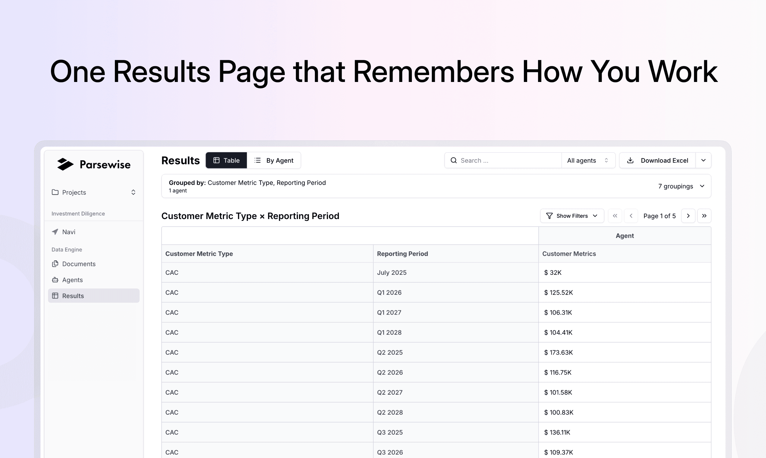 At the center of the Parsewise platform is the Data Engine. From a user's perspective, the flow is straightforward: upload documents, describe what you need from them, launch agents, review results, and refine. Behind the scenes, the platform seamlessly handles extraction, resolution, validation, deduplication, and cross-document reasoning. The structured data it produces feeds everything else on the platform, from Navi's contextual analysis to automated evaluation and client-ready reports.
