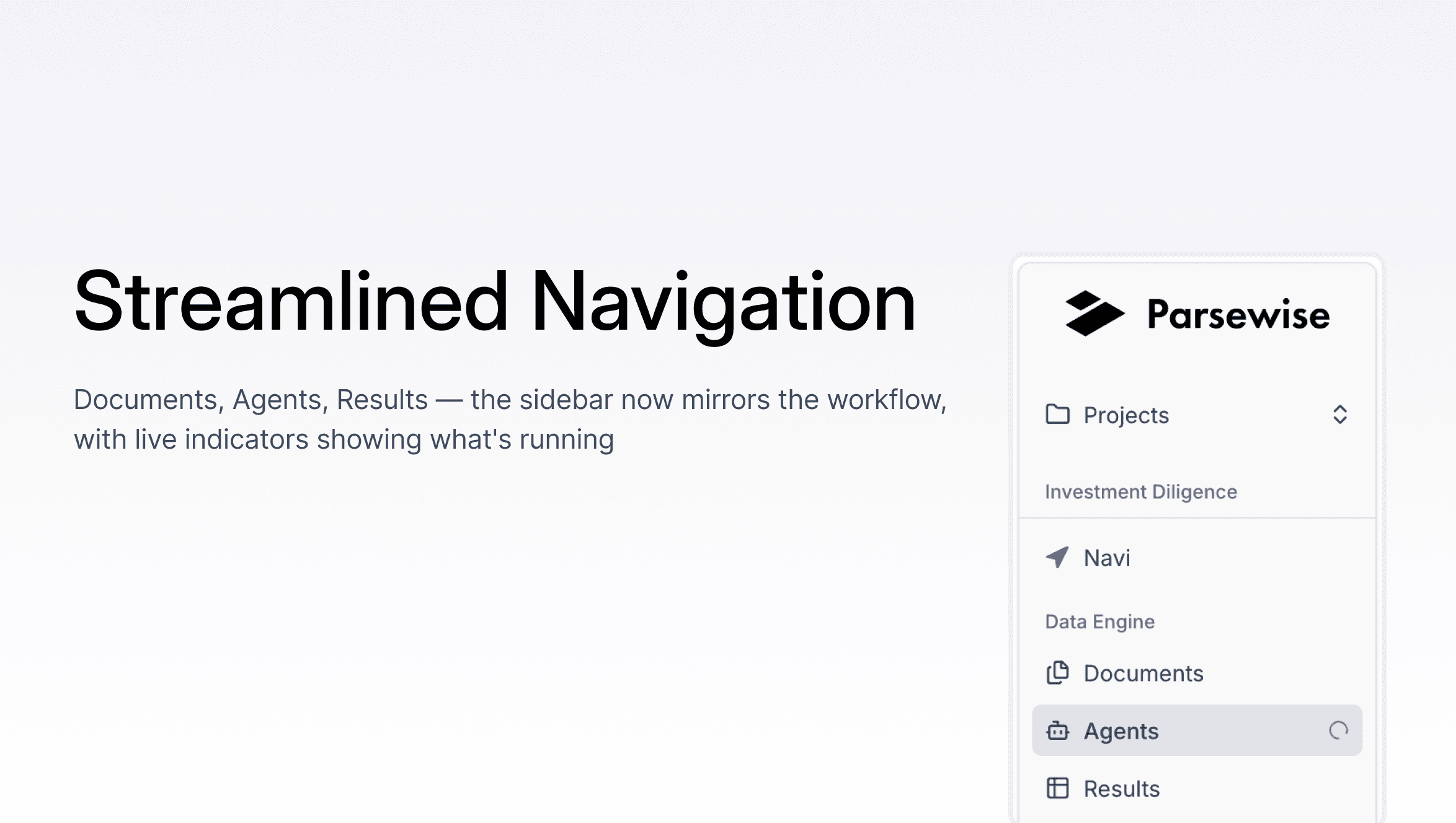 The sidebar now has a single "Data Engine" group with three items: Documents, Agents, Results, matching the workflow sequence. Each item also carries a live status indicator, so you can see at a glance from any page whether documents are processing or agents are running. This is especially useful for longer-running reasoning tasks: you can work on something else in the platform and know exactly when the extraction finishes without having to check.