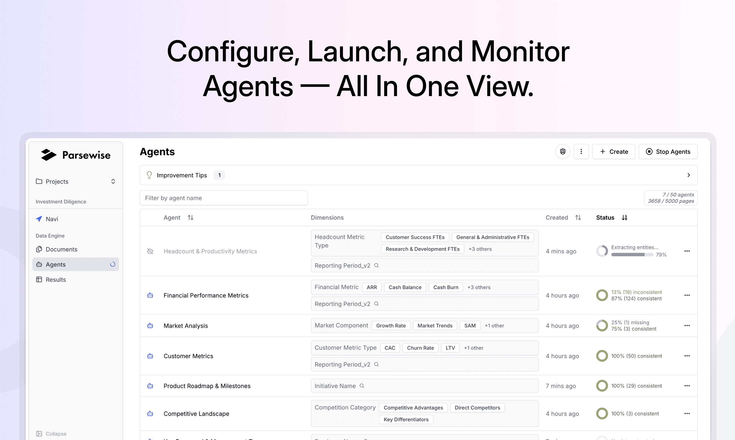 Agent configuration, extraction progress, and consistency now live in a single view. Users can now define, monitor, and review their agents at a glance, enabling more efficient iteration.