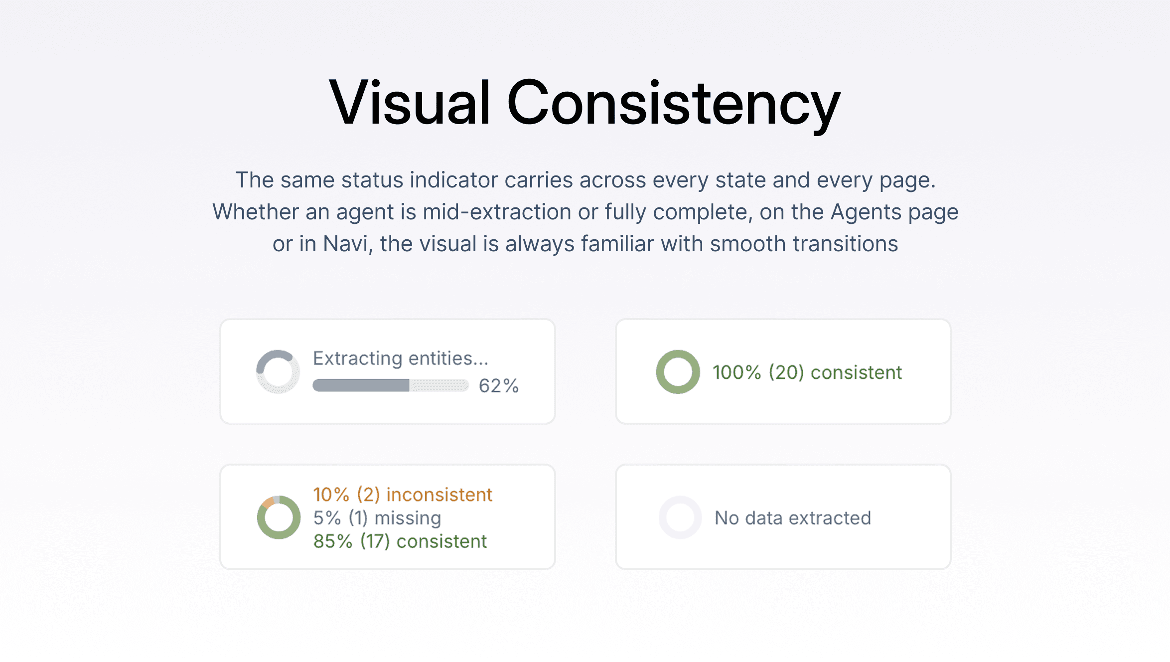 When you launch extraction, the Status column shows real-time progress: an animated spinner that transitions smoothly into a results consistency chart when extraction completes. The spinner and chart are deliberately designed to feel like the same visual element in different states: same size, same position, same stroke width. The same status graphics are also used by Navi, so the visual language is consistent regardless of where you are in the platform.